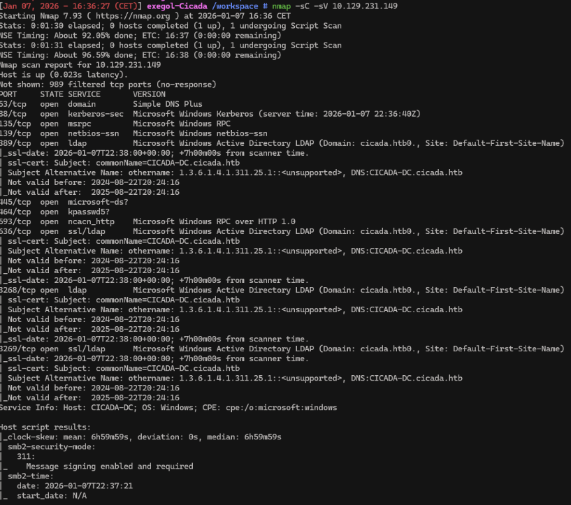 Starting with a standard Nmap scan, we quickly notice several open ports. Services like Kerberos on port 88 and LDAP/LDAPS on ports 389, 636, 3268, and 3269 clearly point to a Windows machine. The scan also reveals the domain cicada.htb and the host name CICADA-DC.