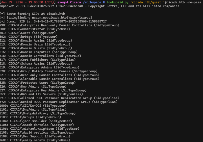 With this password in hand, the next step is to check whether any domain accounts are still using it. To do that, we first need a list of all domain users. We can enumerate them using Impacket’s lookupsid module, which brute-forces Windows SIDs to identify AD users. For this enumeration, we specify the guest account, the domain name, and the -no-pass option.