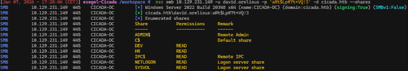 nxc smb 10.129.231.149 -u david.orelious -p 'aRt$Lp#7t*VQ!3' -d cicada.htb --shares