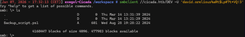 smbclient //cicada.htb/DEV -U 'david.orelious%aRt$Lp#7t*VQ!3'