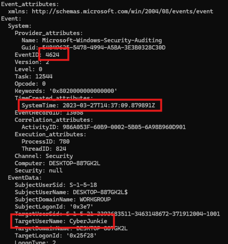 You have been presented with the opportunity to work as a junior DFIR consultant for a big consultancy. However, they have provided a technical assessment for you to complete. The consultancy Forela-Security would like to gauge your Windows Event Log Analysis knowledge. We believe the Cyberjunkie user logged in to his computer and may have taken malicious actions. Please analyze the given event logs and report back.
